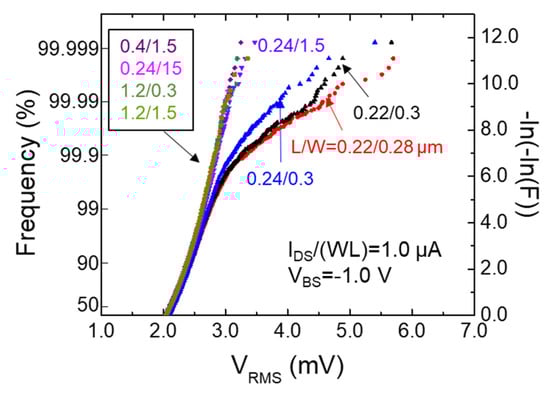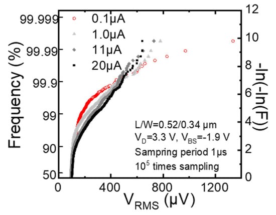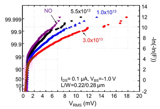 - Abe, K.; Sugawa, S.; Watabe, S.; Miyamoto, N.; Teramoto, A.; Toita, M.; Kamata, Y.; Shibusawa, K.; Ohmi, T. Statistical Analysis of RTS Noise and Low Frequency Noise in 1M MOSFETs Using an Advanced TEG. In Proceedings of the 19th International Conference on Noise and Fluctuations, Tokyo, Japan, 9–14 September 2007; pp. 115–118. [Google Scholar]
