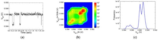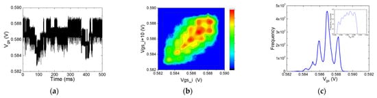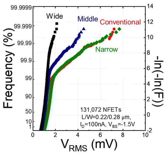 - Abe, K.; Sugawa, S.; Watabe, S.; Miyamoto, N.; Teramoto, A.; Kamata, Y.; Shibusawa, K.; Toita, M.; Ohmi, T. Random Telegraph Signal Statistical Analysis using a Very Large-scale Array TEG with 1M MOSFETs. In Proceedings of the IEEE Symposium on VLSI Technology, Kyoto, Japan, 12–14 June 2007; pp. 210–211. [Google Scholar]