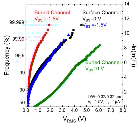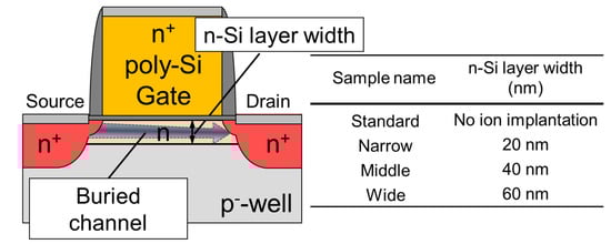 - Suzuki, H.; Kuroda, R.; Teramoto, A.; Yonezawa, A.; Sugawa, S.; Ohmi, T. Impact of Random Telegraph Noise Reduction with Buried Channel MOSFET. In Proceedings of the 2011 International Conference on Solid State Devices and Materials, Nagoya, Japan, 28–30 September 2011; pp. 851–852. [Google Scholar]