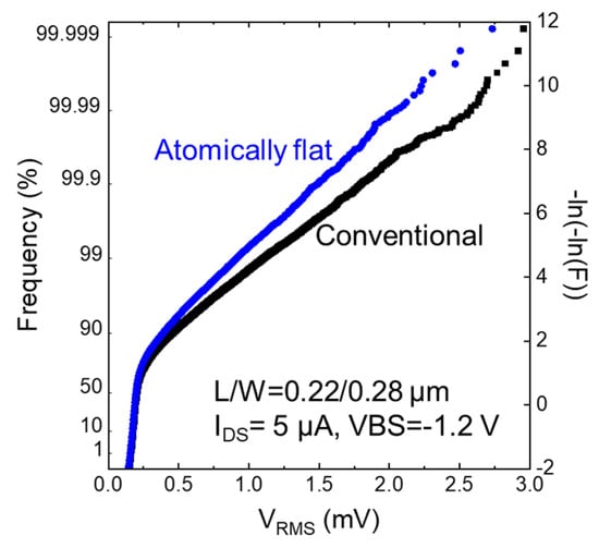 - Gaubert, P.; Kircher, A.; Park, H.; Kuroda, R.; Sugawa, S.; Goto, T.; Suwa, T.; Teramoto, A. Atomically flat interface for noise reduction in SOIMOSFETs. In Proceedings of the 24th International Conference on Noise and Fluctuations, Vilnius, Lithuania, 20–23 June 2017. [Google Scholar]