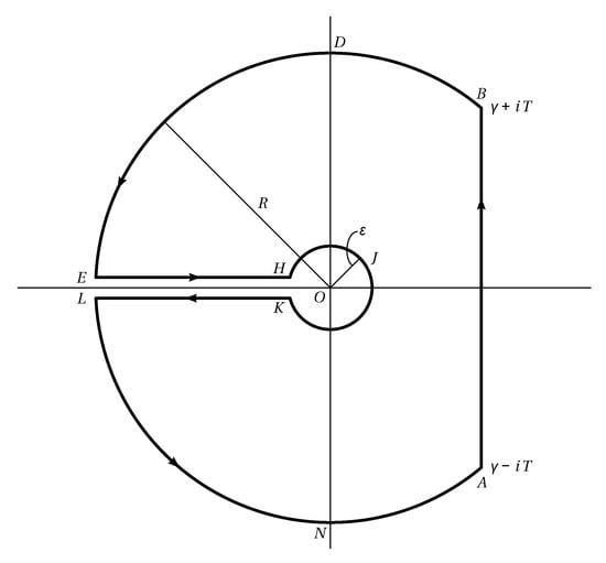 We can calculate the integral from (2) using residue theorem and appropriate integration contour. As function (3) branches at the origin, we need Bromwich contour (Figure 1) with . It is clear that function (3) does not have poles inside the contour, then