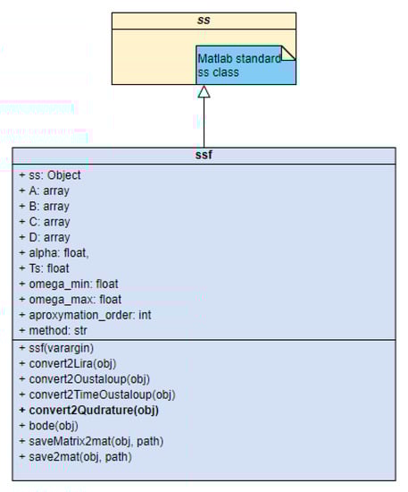 In SoftFRAC classes we implemented the method of conversion between different the approximation methods described in the previous. Because we used inheritance mechanism in the implementation. The user can use all functionalities of parent classes ss and tf. In particular, the user can use this realization to Simulink® simulation, system behavior analysis, and easy plotting of dynamic characteristics. We have added to the classes a construction method for easy conversion between those types, from ssf to tff, and vice versa. We present the UML diagram of the ssf class implementation in Figure 2.