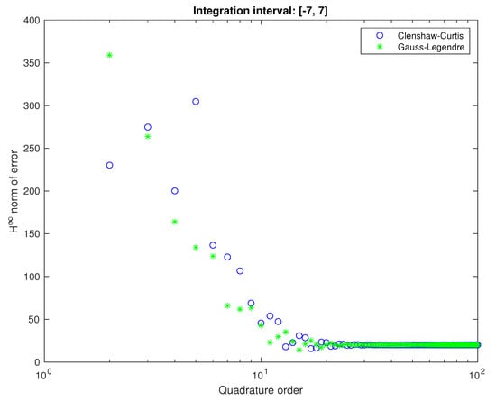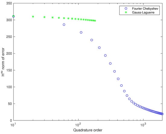 We increased the order of quadrature in order to observe the change of norm of . In the Figure 3 we depicted this analysis. In the figure, we see quite slow convergence (especially linear). We computed Laguerre–Gauss quadrature only up to 180 order because of its numerical instability. Calculating the poles of Laguerre polynomials is also a known problem [].