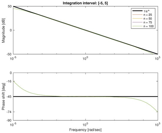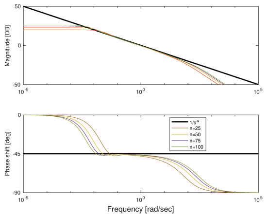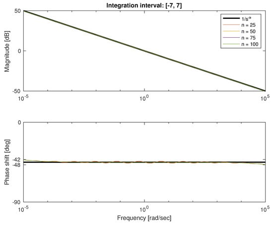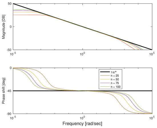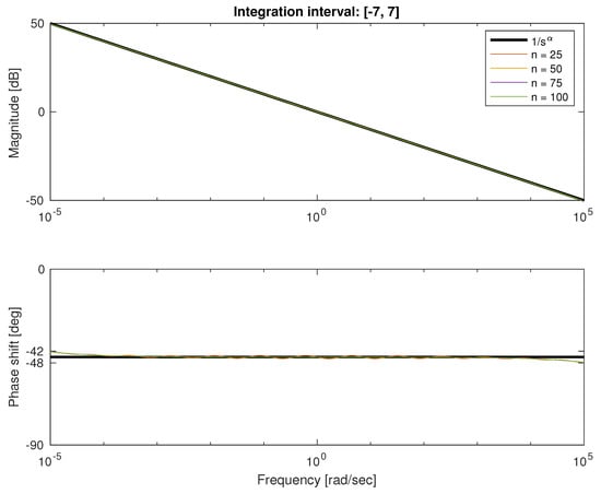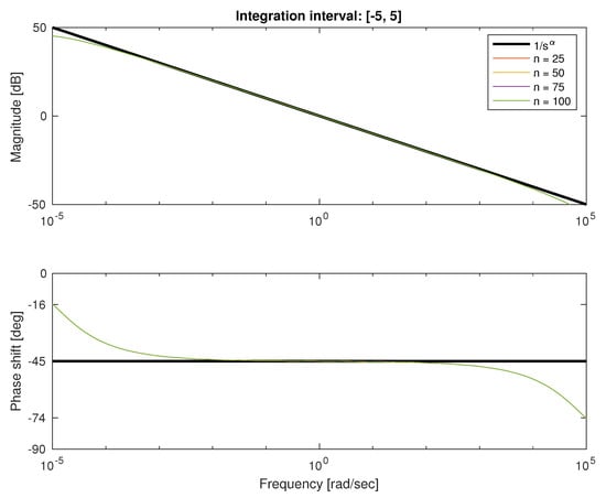 We conducted also a detailed analysis of Bode plots for both types of quadratures. In Figure 4 and Figure 5, we depicted the characteristics for frequency rad/s and approximation order ranging from 25 to 100. We can see that both approximations show good fitness in the middle of frequency interval and errors on both ends. The error for low frequencies in natural because it is impossible to get infinite gain with a finite number of first-order lag systems. Similarly, the error for higher frequencies results from the difference between order of numerator and denominator of approximation. Because transfer function is strictly proper, it damps high frequencies at least 20 db/dec. Note that for Fourier–Chebyshev quadrature, the interval of fitness is wider.
