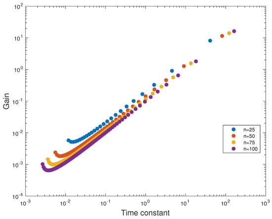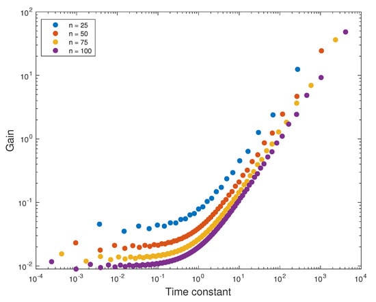 We can observe the cause of such fit in Figure 6 and Figure 7. Their (for various orders) gains are presented as a function of time constant for the terms of approximating sum (19). We can see that for Fourier–Chebyshev we have the most time constants between 1/10 and 10 s (it increases with increasing approximation order). In case of Gauss–Laguerre quadrature, the time constants are gathered around 0.01 s. Moreover, for Fourier–Chebyshev the time constants cover wider range of frequencies for the same approximation order. The difference between the smallest and largest time constant is 4 decades in comparison with 8 for Fourier–Chebyshev. It can be also seen that the biggest gain is for the longest time constant.