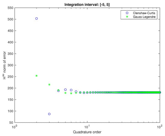 Gauss quadratures, thanks to orthogonality, are exact for polynomials of twice higher order than other interpolation quadratures. In practice Clenshaw–Curtis quadrature offers very similar precision []. Moreover, it has much smaller computational complexity. It should be also noted, that while based on interpolation both of these quadratures are immune to Runge’s phenomenon, as both Legendre and Chebyshev nodes have asymptotic distribution of for interval.