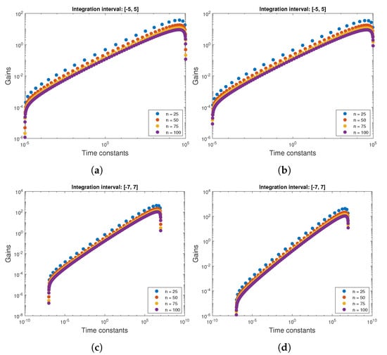 Comparison of time gains and time constants for bounded domain quadratures. For both methods distribution of gain-time constant pairs is similar with concentration of time constants ant the integration interval boudary (a) Clenshaw–Curtis quadrature on the [−5, 5] interval; (b) Gauss–Legendre quadrature on the [−5, 5] interval; (c) Clenshaw–Curtis quadrature on the [−7, 7] interval; (d) Gauss–Legendre quadrature on the [−7, 7] interval.