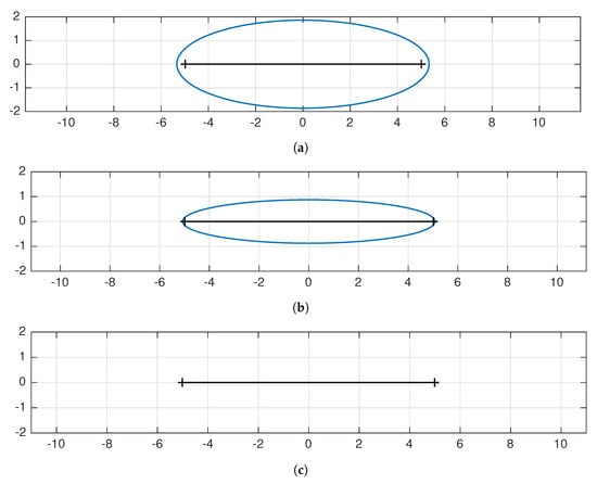Bernstein ellipses for different points at the frequency response. According to Bernstein theorem convergence speed of analytic functions is controlled by the ρ coefficient which is the sum of lengths of both semiaxes. Approximated function is analytic for all frequencies in the integration interval, but for low frequencies analyticity region is vanishingly small. (a) Bernstein ellipse for integrated function in (22) for the frequency ω = 105 rad/s. ρ coefficient is approximately 3 ensuring fast convergence. (b) Bernstein ellipse for integrated function in (22) for the frequency ω = 1 rad/s. ρ coefficient is approximately 2, which is still fast converging. (c) Bernstein ellipse for integrated function in (22) for the frequency ω = 10−5 rad/s. ρ coefficient is approximately 1, which causes convergence to be very slow.