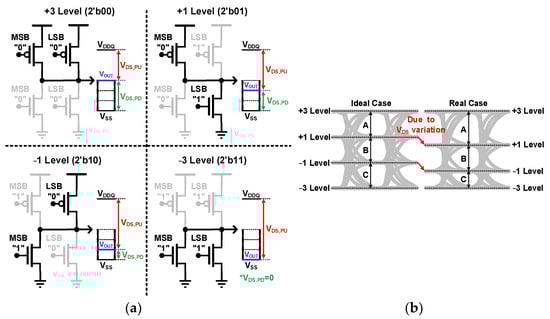 Figure 1a shows VDS variation of the single-ended voltage-mode PAM-4 driver. The variation of VDS,PU and VDS,PD in the pull-up and pull-down transistor occurs as the output signal level changes from one level to another level; this causes variation of the transistor’s on-resistance, distorting the output signal level. Figure 1b shows the output eye diagram considering VDS variation. The output signal level is deviated from the ideal level, deteriorating the level separation mismatch ratio (RLM) that is a function of the intervals between the four PAM-4 output levels. Since the performance of PAM-4 signaling is determined by the smallest eye, calibration for each signal level needs to be made, taking into account VDS fluctuation.