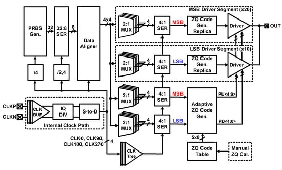 Figure 5a shows an output driver circuit diagram using a data and driver code encoder [,]. When the encoder is placed in front of the output driver, the data and the driver code are encoded, and then encoded data are sent to the output driver; this can make the output driver configuration simple. However, the propagation delay of the data path increases by the delay of the encoder, increasing the power-supply-induced jitter and deteriorating the output drift characteristics in memory interfaces []. The proposed output driver in Figure 5b can improve these issues by removing the encoder. Each driver segment has a source-series terminated structure. All segments share a 71 Ω passive resistor to improve linearity, and 5 bit PU/PD codes from the adaptive ZQ code generator control the driver’s on-resistance.