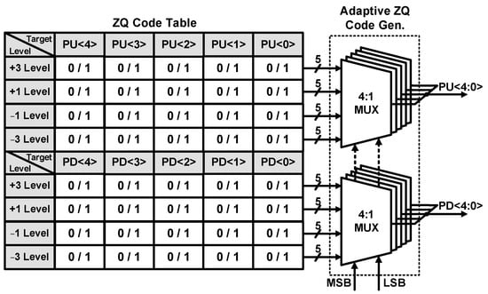 The ZQ code table has two 4 × 5 structures for PU/PD codes, as shown in Figure 4. During the ZQ calibration, the ZQ code table is filled with 0 or 1 for all output signal levels. The adaptive ZQ code generator consists of ten 4:1 MUXs. This generator uses the MSB/LSB data to adaptively select codes from the ZQ code table and transmits corresponding codes to the output driver as PU<4:0> and PD<4:0>. The mismatch of the propagation delay between the transmitted codes and the data can degrade the overall performance of our structure. Therefore, a ZQ code generator replica is placed at each driver segment as a delay matching component, as shown in Figure 2.