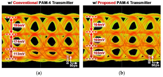 Figure 8 shows the measured PAM-4 eye diagrams at 18 Gb/s/pin, with the conventional and proposed PAM-4 transmitter. In this measurement, the PRBS-7 data pattern and the FFE coefficient of 1.94 dB were used. Since the conventional PAM-4 transmitter uses fixed PU/PD codes, eye distortion occurs due to the VDS fluctuation; the voltage gap between signals from top to bottom are 195 mV, 174 mV, and 113 mV, resulting in an RLM of 0.703, and the worst eye height of 32.4 mV (Figure 8a). When the proposed method is applied, eye distortion is compensated; the voltage gap between signals is 164 mV, 160 mV, and 155 mV, respectively, achieving an improved RLM of 0.971 (Figure 8b). With this method, the worst eye-opening also increases to 75.9 mV. Although this method has the better RLM performance, its structure using single-ended signaling may make the PAM-4 eye diagram look somewhat less symmetrical than an eye diagram based on differential signaling [,].