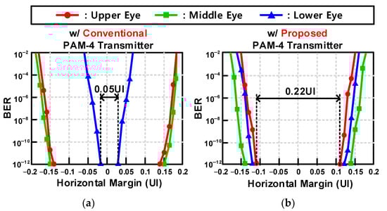 Figure 9 shows the measured BER bathtub curves of the upper, middle, and lower eye at 18 Gb/s/pin, with the conventional and proposed PAM-4 transmitter using the PRBS-7 data pattern and the FFE coefficient of 1.94 dB. When the proposed method is not applied, a minimum horizontal margin at a BER of 10−12 is only 0.05 UI (Figure 9a). With the proposed PAM-4 transmitter, the minimum horizontal margin increases to 0.22 UI at a BER of 10−12 (Figure 9b).