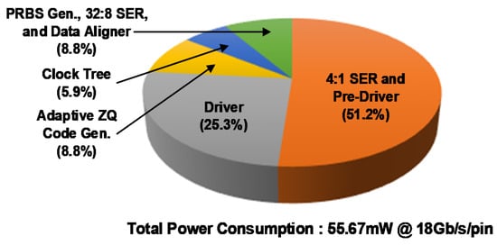 Figure 10 shows the power breakdown of the proposed PAM-4 transmitter at 18 Gb/s/pin. The 4:1 SER and pre-driver occupy the largest proportion with 51.2% of the total power consumption, followed by the driver occupying 25.3%.