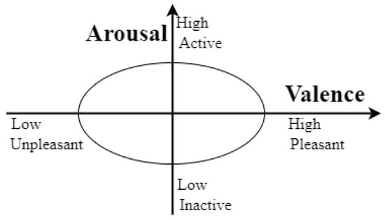 - Calculate valence and arousal: The emotions of are treated as positive while are treated as negative. The valence and arousal values of can be obtained by Equation (10):