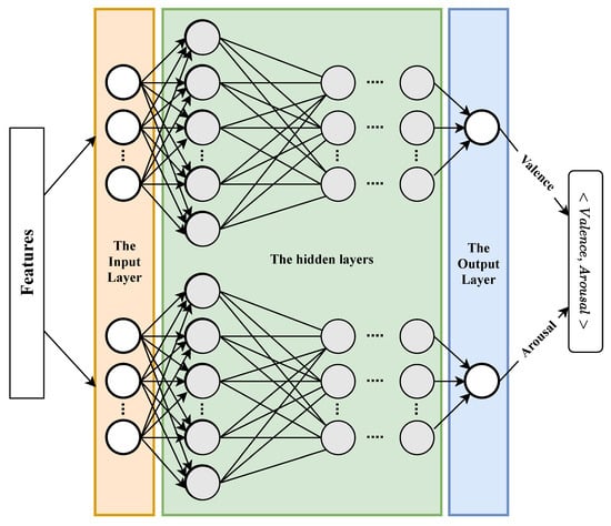 The architecture used two deep neural networks to predict the and respectively. Each network consists of an input layer, hidden layers, and an output layer. The input layer consists of the vector within which the features are converted to numerical representations as mentioned above. The hidden layers can be customized to investigate the feature-emotion interactions. The output layer is the predicted and . The total quantity of nodes in the hidden layers is set by Equation (11) to ensure the accuracy and training speed of emoDNN [67]: