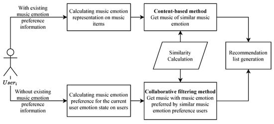 When a user enters the recommendation process at time , the method first decides whether there the music emotion preference of the user exists in the system. The process can then be described as: