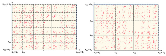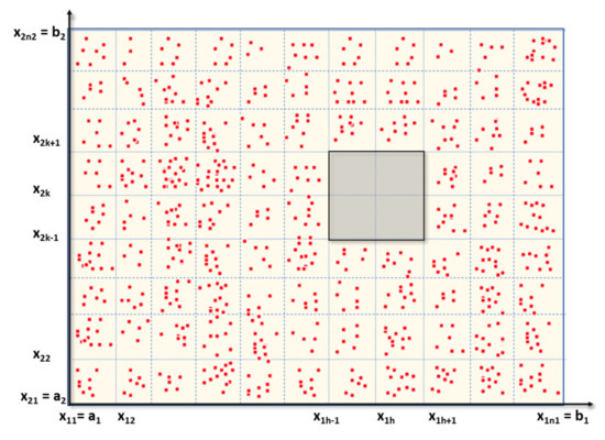 In Figure 1 an example of data points not sufficiently dense with respect to the fuzzy partition is shown. Let be a fuzzy partition of the domain [a1,b1] and be a fuzzy partition of the domain [a2,b2]. The data points are shown in red. No data points are located within the subset , corresponding to the dark yellow area in Figure 1. Consequently, for each data point pj = (pj1, pj2) j = 1, …, N we have and . Then, the data are not sufficiently dense with respect to this set of two fuzzy partitions.