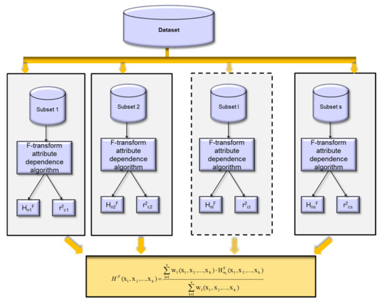 In Figure 4 the MFAD method is schematized. Each subset is treated separately by applying the F-transform attribute dependency algorithm. The regression function is constituted by the weighted average of the single inverse-fuzzy transforms where the weights are the values of the index of determinacy obtained for each subset.