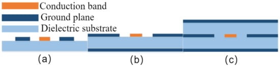 Various waveguide structures. (a) Section of traditional coplanar wave; (b) cross section of coplanar waveguide with metal substrate; (c) cross-sectional view of ribbon coplanar waveguide.