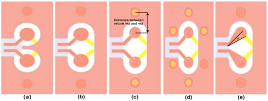 (a) Simulation modeling diagram of circular reverse pad; (b) simulation modeling diagram of joint reverse pad; (c) simulation modeling diagram of two return vias; (d) simulation modeling diagram of eight return vias; (e) via tear drop simulation modeling diagram.