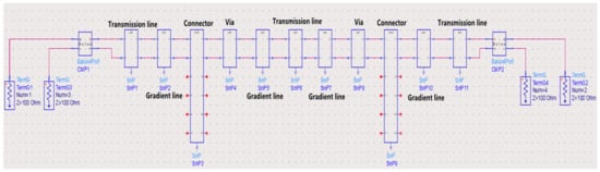 A complete backplane passive link is built in ADS for simulation, and a channel in the backplane passive link is taken as an example for simulation verification. The model consists of two high-speed connectors, two pairs of differential vias and a coplanar waveguide transmission line. The connector and transmission line are interconnected by klopfenstein tapered transmission line [,,,]. The parameters of the high-speed connector are S-parameters provided by the official website of TE Connectivity []. The differential vias model adopts the traditional circular reverse pad via model and does not back drill the via stumps. The transmission line adopts the traditional microstrip coplanar waveguide transmission line. The S-parameter models of connector, via and transmission line are imported into ADS software for co-simulation. The S-parameter modeling diagram of the constructed complete transmission link is shown in Figure 9, in which the circuit stack adopts the 10 layers board stack used in the previous simulation, and the transmission line length is set to 5000 mil [,,].