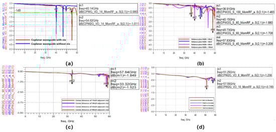 Simulation analysis was carried out to study the influence of relevant parameters of the transmission line on resonance and signal transmission bandwidth. The parameters to be determined are: (1) the width of the reference plane W; (2) center distance VVL between the connected vias; (3) the diameter of via VD. The value of the VSL is independent of the resonant frequency. Due to the need to determine many parameters, this paper used the control variable method. The simulation results are shown in Figure 11. In Figure 11a, the effect of introducing or not introducing via on insertion loss is compared. In Figure 11b, except for the reference plane, width W changes from 40 mil to 100 mil, the other parameters of transmission line remain unchanged, VSL = 20 mil, VVL = 30 mil, VD = 10 mil. In Figure 11c, except for the center distance, VVL changes from 15 mil to 90 mil, the other parameters of transmission line remain unchanged, VSL = 20 mil, W = 40 mil, VD = 10 mil. In Figure 11d, except for the via diameter, VD changes from 8 mil to 14 mil, the other parameters of transmission line remain unchanged, VSL = 20 mil, W = 40 mil, VVL = 30 mil.