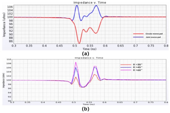 Through the simulation analysis, using joint reverse pad and circular reverse pad, the impedance fluctuations are 7 and 15 Ω, respectively, as shown in Figure 12a. Therefore, the parameters will be optimized based on the joint reverse pads. The best parameters are as follows: pad diameter is 14 mil, reverse pad diameter is 45 mil, via stump depth is 20 mil, six return via, distance between return via and signal via is 35 mil, tear angle is 30 degrees. Figure 12b shows that the impedance fluctuation of differential vias with optimal parameters is 100 ± 3 Ω which can be reduced by 70% compared to 100 ± 10 Ω impedance fluctuation of 100GBASE-KR4 standard.