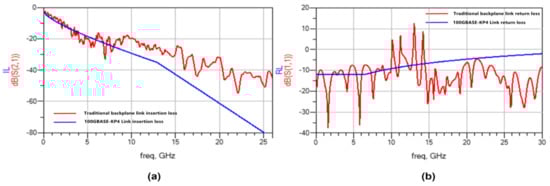 (a) Insertion loss diagram of traditional backplane link S-parameter model; (b) return loss diagram of traditional backplane link S-parameter model.
