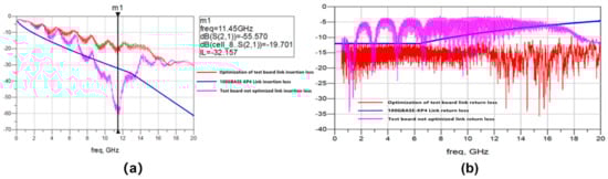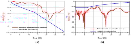 The conclusion of the above three parts of optimization is integrated. Using strip coplanar waveguide transmission line and the metal plate height is 4.5 mil. The parameters of reference plane are VSL = 20 mil, W= 40 mil, VVL = 30 mil, VD = 12 mil. Additionally, using joint reverse pad shape on differential vias and the parameters of pad diameter is 14 mil, diameter of reverse pad is 45 mil, via stump depth is 20 mil, six return via, distance between return via and signal via is 35 mil, tear angle is 30 degrees. The insertion loss and return loss after link optimization are shown in Figure 14a,b.