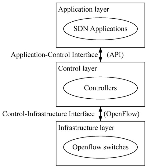 An SDN is an emerging network framework that separates the control plane from the data plane. There are three layers in an SDN architecture: the application, control, and infrastructure layers. The application layer uses application programming interfaces to communicate with controllers. The OpenFlow protocol [11] is the first standardized protocol defined between the control and infrastructure layers, allowing network administrators to determine how data flows should be routed between switches and network entities in networks. With flexibility and central management characteristics, wireless networks can benefit from SDN evolution to meet the burgeoning 5G capacity. Studies [12,13,14,15,16] surveyed several kinds of challenges and issues in SDNs. Figure 1 shows the SDN architecture.