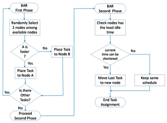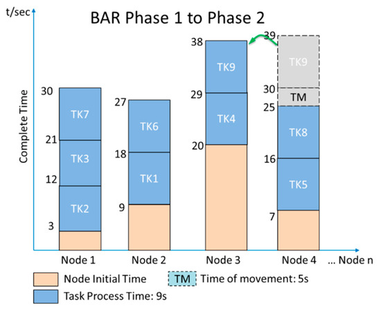 In order to improve the effectiveness of the HDS, a balance-reduce scheduler (BAR) scheme [5] is proposed. The scheduler is composed of job and task trackers. Leveraging the Hadoop and centralized scheduler, the BAR method globally adjusts the tasks and node assignments of a job. As a result, a job is divided into multiple tasks, and the scheduler effectively assigns them to available nodes. Figure 4 shows the flowchart of the BAR, which is a two-phase method. The first phase is similar to the HDS method, i.e., it divides and assigns tasks to each node. In the second phase, the BAR method searches and evaluates the time of the current nodes and assigns a task with the longest time length to an idle node with the least time, thereby reducing the total process time. Following the same example as the HDS, the BAR method considers the time of moving a task from one node to another. It then keeps TK9 at its original node in the process. Although there is no movement between nodes, the overall completion time is reduced to 38 s, as shown in Figure 5.