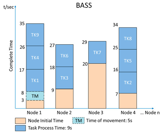 Bandwidth-aware scheduling with SDNs in Hadoop (BASS) [6,7] is a method based on the BAR and Hadoop. BASS treats task efficiency as an NP-complete problem [19,20,21] which defines, schedules, and evaluates the cost of tasks and then simulates tasks to an optimal solution after complex computation. In addition, the BASS method considers the bandwidth of each node, and tasks are assigned to nodes that have the bandwidth to handle such tasks. Then, the Pre-BASS scheme, which adds a prefetching scheme based on BASS, is proposed. Figure 6 shows the flowchart of BASS and Pre-BASS, and Figure 7 shows an example of task assignments by BASS. TK1 only has a replica on Node 2 and Node 3, and their process completion times are 18 and 29 s, respectively. From a global perspective, Node 1 has the least completion time, including movement time for the task. The total completion time of TK1 is 17 s; this means that Node 1 is the best choice among the nodes. Therefore, the overall completion time for the BASS method is only 35 s.