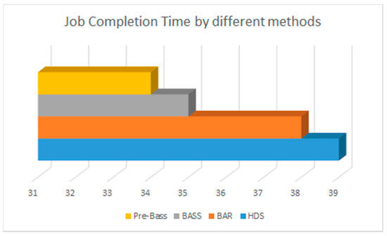 With another method [7], leveraging SDN scheduler features, the status of each node can be prefetched to the SDN scheduler. Then, when a new job arrives, the scheduler divides the TK evenly, without creating a replica to the node, and assigns the tasks one by one to the nodes with the shortest completion time. In Figure 8, the movement time of TK1 is not required; the overall completion time of the prefetch method is 34 s, and TK8 becomes the last task to be completed among all nine tasks. Figure 9 shows the performance of different methods in terms of completion time. In the figure, the Pre-BASS scheme has the shortest completion time. However, in the Pre-BASS method, each node still completes the task at a different time.