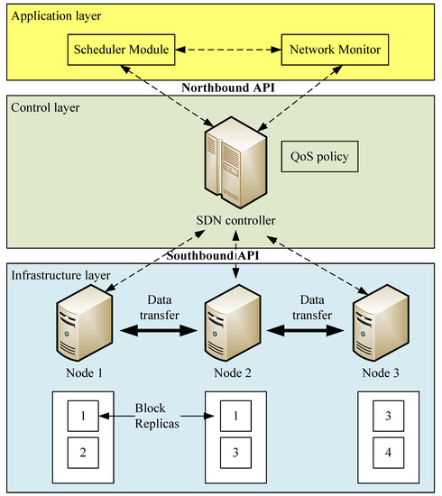 This section describes the proposed scheme BARE for SDN-based data centers. BARE includes four parts: global information collection, the task assignment scheme, the task splitting scheme, and the task rescheduling algorithm. Figure 10 shows the proposed BARE architecture. The dotted line represents control signaling, and the solid line represents data flow. One job can be divided into many small tasks. The scheduler module is responsible for scheduling tasks. If a task has a different priority, it is put in different queues. The number of block replicas is set to three, which is the default setting in Hadoop. Since most cloud computing systems are implemented on virtual hardware [22,23], data transfer cost significantly influences system performance [24,25].