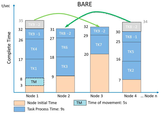 In this case, the difference in TP is solved because the last two tasks are evenly split into four subtasks in BARE. Then, an evaluation for the node with the least completion time, the subtask movement time, and the processing time is performed. After the evaluation, if a new node with the second portion of the subtask can complete the task faster than the original node, the second portion of the subtask is transferred to the new node. This evaluation is performed twice for the last two tasks. Note that the new evaluation time Ci,j includes (1 − SPm-z)TMi,j + (1 − SPm-z)TPi,j + Idleminnow.