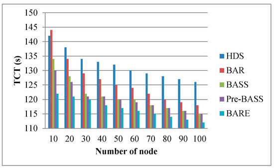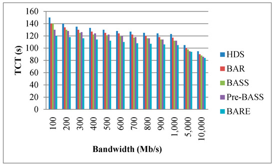 Figure 13, Figure 14 and Figure 15 show the TCT performance with different parameters, including bandwidth, data size, and the number of nodes. Figure 13 shows that BARE has the best result. The HDS does not use the bandwidth as a parameter for task allocation. BAR is based on the allocation of the HDS and attempts to adjust the latest task completed on a job. If the latest task completed in other nodes can be completed in advance, the task is redistributed to reduce the job completion time. BASS also uses network bandwidth as a parameter for task assignment. Before task assignment, however, the maximum bandwidth in a network needs to be sliced by time. Compared with BARE, this is an additional task, and BARE makes full use of a network’s maximum capacity. The remaining bandwidth is more suitable for actual scenarios. In addition, when the bandwidth is sufficiently large, the data movement time (i.e., TMij) from node i to node j approaches zero. Therefore, the TCT of all methods will be drastically reduced. Figure 14 shows a trend that the TCT decreases when nodes are added; this is because more nodes can reduce the amount of workload. According to the results, BARE significantly reduces the TCT using task splitting and rescheduling mechanisms. Note that more nodes signify more cost. Performance and cost are a trade-off problem. This issue is beyond the scope of our study. Figure 15 shows that the bigger the data size, the longer the TCT. BARE is proven to have the best results. In a large data size environment (i.e., data size is 1000 MB), BARE improves the performance of the HDS, BAR, BASS, and Pre-BASS by 45%, 31%, 12%, and 10%, respectively. The task splitting and rescheduling mechanisms can effectively shorten the TCT.