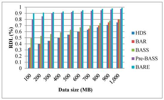 Figure 16, Figure 17 and Figure 18 show the performance of the RDL with different parameters. Typically, the processing time of a task is short when data are allocated to the local node. Therefore, the RDL is a key factor for scheduling algorithms in data centers. The RDL of BARE and Pre-BASS is high because they use a prefetching mechanism in the task assignment phase. The prefetching scheme guarantees that the allocated tasks are all optimal in terms of completion time. Generally, the TCT reduces when tasks are assigned to the same local node. Figure 16 shows that the bandwidth of the link increases (i.e., signifying that TMi,j decreases), and the RDL is slightly decreased. When the movement time and processing time of other rocks are less than the processing time of the local rack, the data are not processed locally and are then transferred to other racks (i.e., it means the RDL decreases). Interestingly, we can observe a specific situation taking place. When the bandwidth is sufficiently large, the overall execution time and RDL are reduced; this is because the data movement time is close to zero. Therefore, when the execution time of the remote node, along with the data movement time, is less than the execution time of the local node, the central scheduler will select the remote node to perform the work. In Figure 17, the number of nodes increases, and the RDL decreases. In Figure 18, the data size increases, and the RDL also increases. These results emphasize that our BARE scheme works best. BARE collects global information, uses the prefetching scheme to improve the performance of the local node, optimally assigns tasks to the most suitable node, and performs the rescheduling procedure.