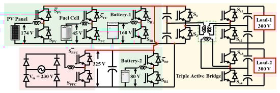 - Boost converter-based integrated renewable energy sources (PV panel and fuel cell stacks) and battery storages (Battery–1 and Battery–2) supplying power to the load depending upon the availability.