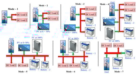 For system-level control, operating modes (depending upon availability) are scheduled. Here, the variability of solar power in the system-level configuration must be reflected. With this consideration, the different operating modes are identified and are represented pictorially in Figure 4:
