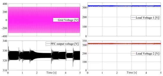Voltages observed at different points in the system—input grid voltage, power factor correction (PFC) circuit output voltage and load voltages measured at the two outputs of the DAB converters.