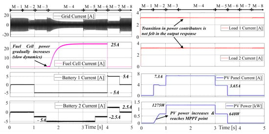 Mode–6: This mode is observed from t = 3.5 s to t = 4 s. At t = 3.5 s, and the PV panel experiences zero solar irradiation (emulating night condition). Due to this elimination of PV contribution, the current reference of Battery 2 is reduced from 5 A to 2.5 A. However, due to the absence of the PV contribution, the grid current now increases from 1.575 kW to approx. 1.8 kW (7.8 A). Conclusively, during this mode, the fuel cell stack and utility grid supply power to the batteries and dc loads.
