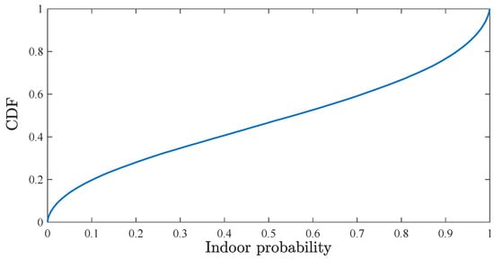 The scenario used to develop the proposed model corresponds to a city of 800,000 inhabitants and its suburbs, covering a geographical area of approximately 125 km. In this area, 400 LTE cells are located, grouped in 175 trisectorized sites, with a carrier frequency of 2325 MHz and a system bandwidth of 15 MHz. In these cells, traces are collected for 2 h, obtaining 166,561 connections. To present the indoor context of these connections, Figure 2 shows the Cumulative Distribution Function (CDF) of the probabilities of each connection to have occurred indoors.