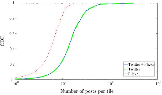 The geotagged social media posts in the area are collected in real-time for 16 months for Twitter and 12 months for Flickr, resulting in 785,515 and 33,519 posts, respectively. Figure 3 shows the CDF of the number of posts in each tile of the scenario, , broken down by application (dashed line for Twitter, and dotted line for Flickr). It can be seen that most of the messages come from Twitter posts (coinciding in their CDF with the distribution of total posts), so it will be the main source of information, leaving Flickr posts as an auxiliary source, to reinforce certain points in the scenario.