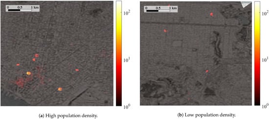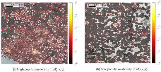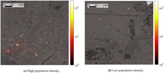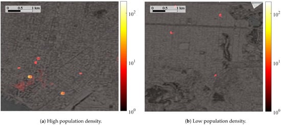 To observe the resolution of the spatial distribution of publications, , Figure 4 presents two sections of in the scenario, one with high population density per square meter (i.e., city center, Figure 4a) and one that is relatively unpopulated (i.e., the suburbs of the city, Figure 4b).