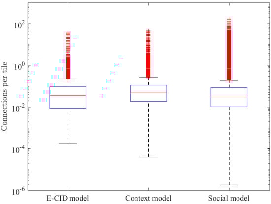 Figure 5 shows the number of connections per tile in the full scenario with a boxplot for the three models assessed (E-CID, context and social model). The ordinate axis is in logarithmic scale aiming to optimize the graphical representation.