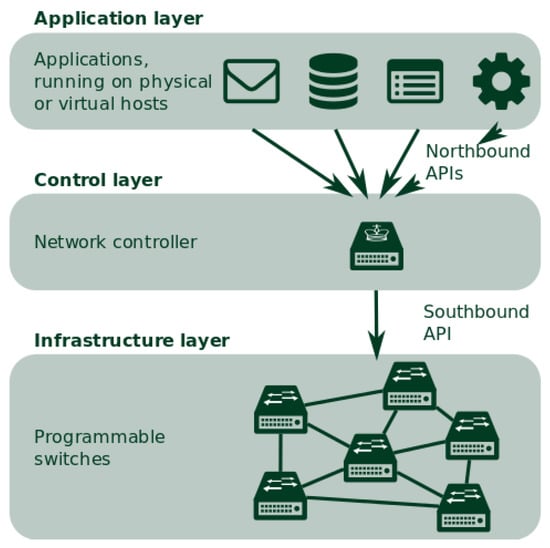 As shown in Figure 4, SDN divides the network into three planes: the data plane, the control plane, and the application plane. The data plane is in charge of sending and receiving network traffic. Decisions about traffic transfer are made in the control plane. The SDN programs are stored in the device plane.
