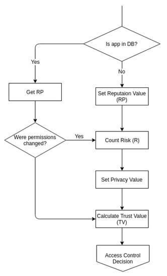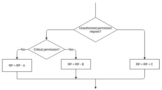 The assessment functionality of this module assists in managing and changing a Reputation Value (RP) depending on the app’s observed behavior. The complete management process is depicted in Figure 8. If the program has requested any illegal rights, this module reduces the RP, and it might increase the RP if no deviant activities have been identified.