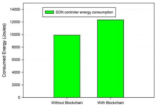 Figure 9 compares the average energy consumption of the SDN controller with and without Blockchain. It shows that using Blockchain increased the energy consumption of the servers by 15% over the standard situation for a number of 2000 patients’ Electronic Health Records (EHR) https://mimic.physionet.org/ (accessed on 29 April 2021). However, when compared to the benefits of a fully distributed school system, this additional overhead is still minimal. Furthermore, if all computations will be performed at the network’s edge, the expense of implementing the whole scheme will be very reduced.