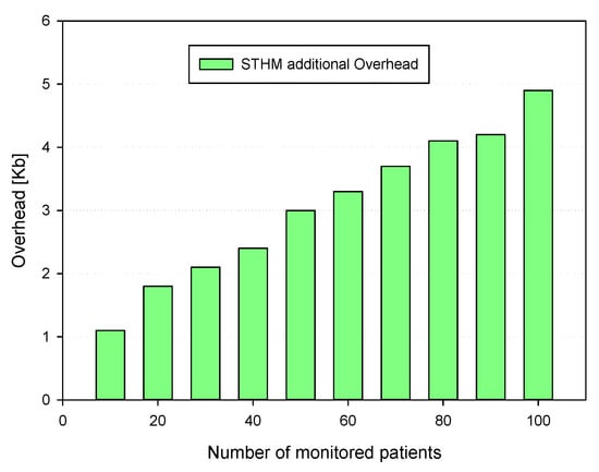 The use of blockchain in STHM results in more messages being exchanged between domains. Figure 11 depicts the produced overhead for various numbers of monitored patients with having an average of four monitored devices. It shows the induced overhead does not exceed 5 Kb, which has no effect on network activity due to the small packets exchanged representing the updates in the patients electronic health records (detection of abnormal situation).
